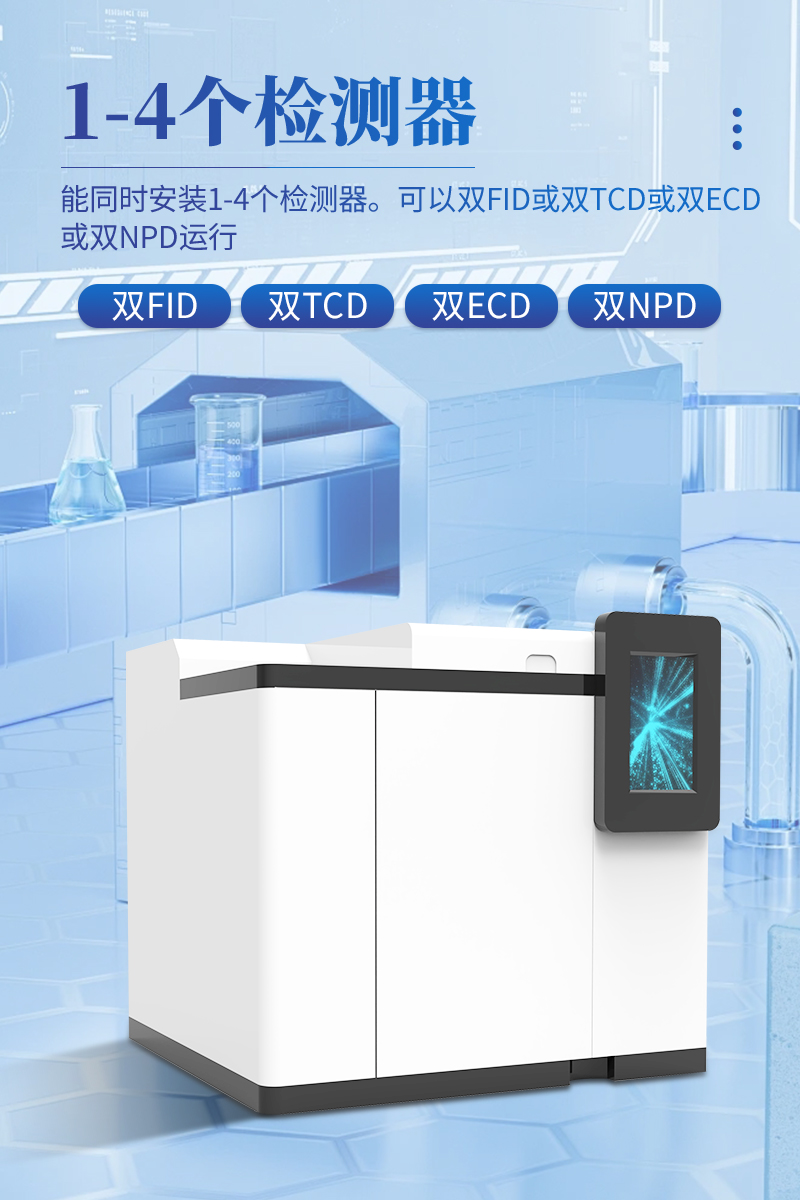 11.能同時安裝1-4個檢測器。可以雙FID或雙TCD或雙ECD或雙NPD運行。TCD帶有雙路柱后補充氣,故可單柱、雙柱、毛細管柱使用。