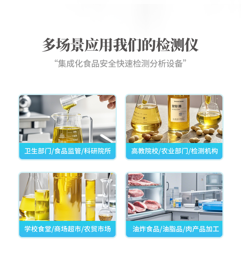 廣泛應用于質量監督檢驗、工商管理、油炸食品生產基地、食藥監局、衛生部門、肉制品食品深加工企業、商場超市、各大食品安全監測系統等單位使用。